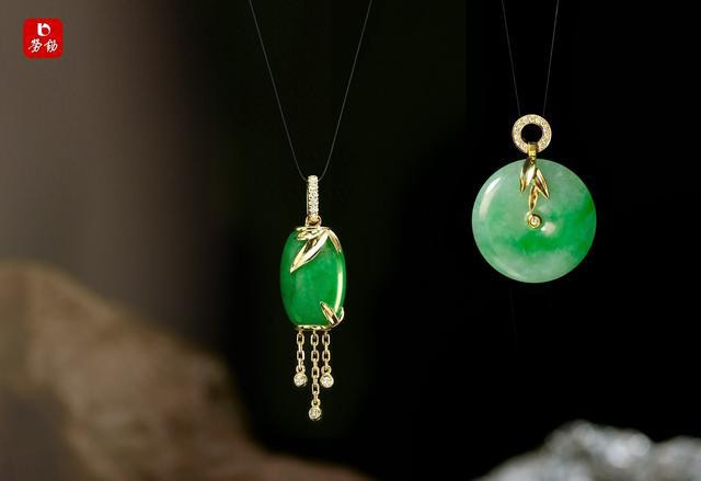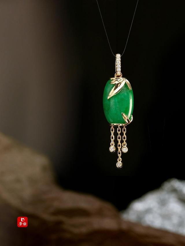 另一件竹节挂件则是写给未来的励志诗。老凤祥的工匠把翡翠雕成竹节,竹节间上巧覆盖着金色的竹叶,阳光下像要滴出《楚辞》里的“纫秋兰以为佩”。最绝的是竹节的弧度——既不是僵直的刻板,也非弯曲的谄媚,恰如苏轼“宁可食无肉,不可居无竹”的文人脊梁。这挂件戴在衬衫领口,低头可见竹影横斜,仿佛把“胸有成竹”的典故戴在了身上,既是对她语文高分的褒奖,更是对未来“节节高升”的期许。竹子四季常青的特质,又暗合了非遗文化里“基业长青”的祝福,让传统美学与青春朝气在翡翠里完成了跨时空对话。